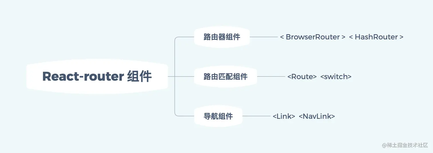 路由器组件: 和 ,路由器组件的作为根容器组件, 等路由组件必须被包裹在内才能够使用。 路由匹配组件: 和 ,路由匹配组件通过匹配 path,渲染对应组件。 导航组件: 和 ,导航组件起到类似 a 标签跳转页面的作用。在后续对源码的讲解中,也将分别以这六个组件代码的解析为线索,来一窥 React Router 的整体实现。看回我们的代码,对于我们开头实现的原生路由,如果用 React Router 改写,应该是怎样的写法呢: