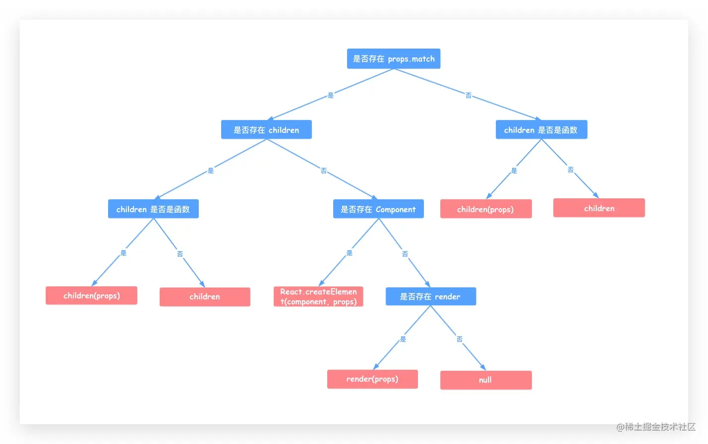 这部分渲染逻辑不用细看,参照下边的树状图理解即可,代码用了四层三元表达式的嵌套,来实现 子组件> component属性传入的组件 > children是函数 这样的优先级渲染。