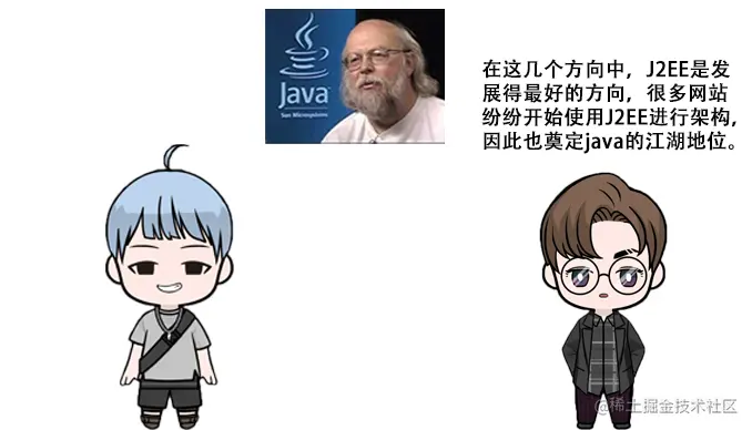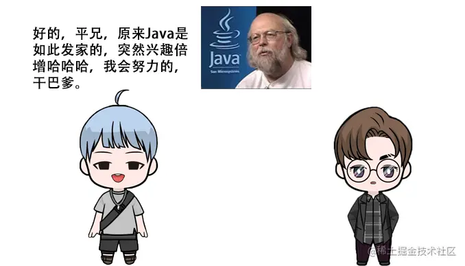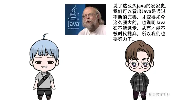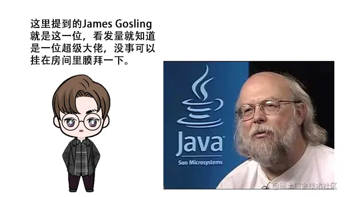 - 1995年5月23日, Oak语言正式更名为Java,因为James Gosling在开发中贡献巨大,所以之后被人们称为“Java之父”,可以理解为Java的祖师爷。