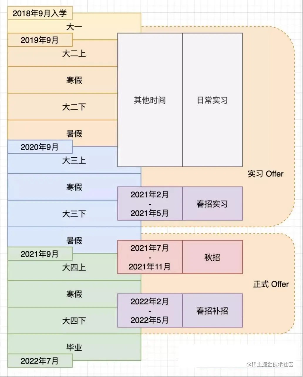 在大三的"金三银四"的春招季就去找暑期实习,这个实习的主要目的是争取转正,提前一步进入大厂拿到正式offer;如果你对暑期实习的公司或部门不满意,或者怕转正不通过,就可以准备"金九银十"的秋招季找别的公司正式工作offer。