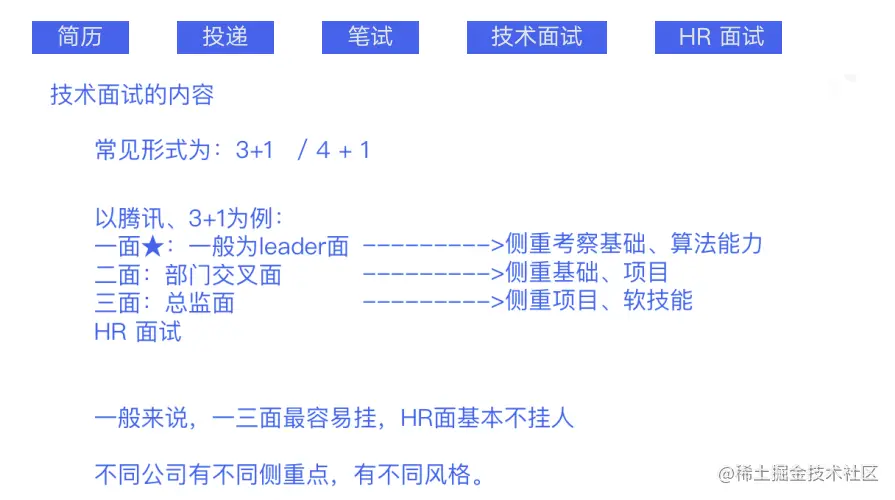 以腾讯为例,腾讯会3+1面试,三次技术面,一次HR面。3+1不是固定的,但是它的面试内容大概是这样子的,一面的话是组内leader面。面试内容主要是计算机基础知识(计算机网络、操作系统),对应岗位的技术栈知识。然后二面的可能是一个部门交叉面,侧重项目和业务场景。三面的话就是总监面,会看一些软技能(对新技术的了解等)。总的来说,前面的面试是纵向深挖,面试官面完基本就可以根据你的面试情况,知识掌握深度,就能确定你能不能通过。后面的面试是横向比较,面试官会根据多个候选人的面试情况,讨论一个排名提交给上面的领导决定。