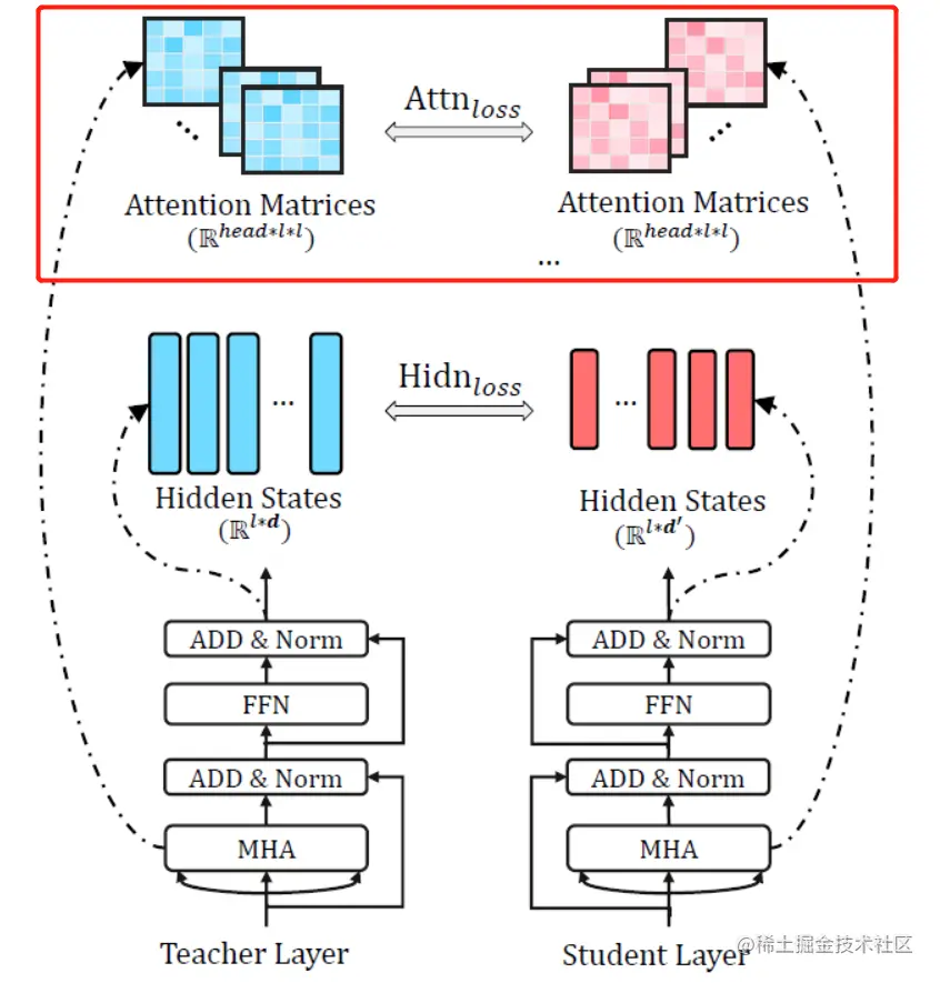 TinyBERT 在 Transformer 层损失函数有两个,第一个是 attention loss,如下图所示。