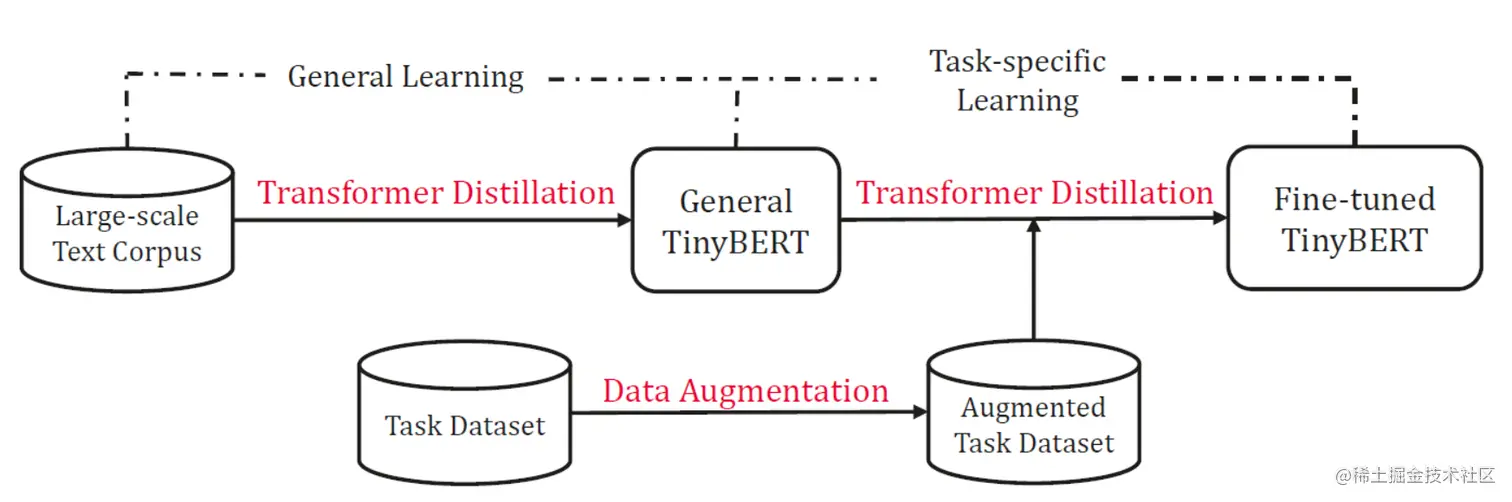 BERT 有两个训练阶段,第一个训练阶段是训练一个预训练模型 (预训练 BERT),第二个训练阶段是针对具体下游任务微调 (微调后的 BERT)。TinyBERT 的蒸馏过程也分为两个阶段。