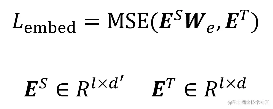 embedding 维度不同,不能直接计算 loss,因此 TInyBERT 增加了一个映射矩阵 We (d'×d) 的矩阵,ES 乘以映射矩阵后维度与 ET 一样。embedding loss 就是二者的均方误差 MSE。