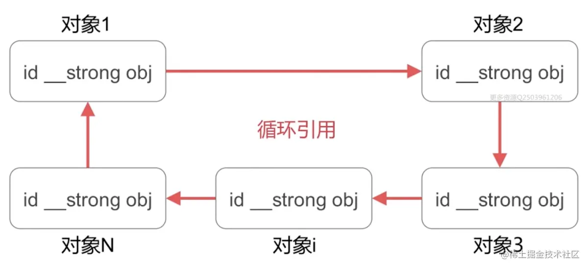 循环引用的实质:多个对象相互之间有强引用,不能释放让系统回收。