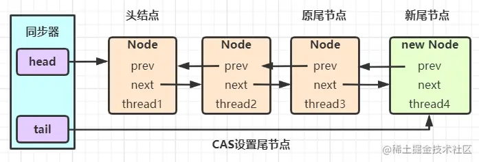 在同步队列为空的情况下,会先创建一个新的空节点作为头节点,然后通过CAS的方式将当前线程创建的Node设为尾节点。在for循环中,只有通过CAS将节点插入到队尾后才会返回,否则就会重复循环,通过这样的方式,能够将并发添加节点的操作变为串行添加,保证了线程的安全性。这一过程可以使用下图表示:
