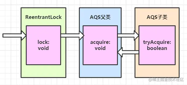以ReentrantLock中的方法调用为例,当调用ReentrantLock中的lock方法时,会调用继承了AQS的内部类Sync的父类中的acquire方法,acquire方法再调用子类Sync的tryAcquire方法并返回boolean类型结果。