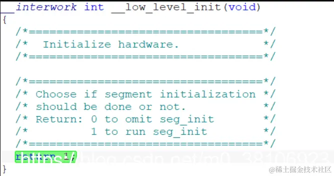 __low_level_init可以在任意的C文件中编写,注意它的返回值,如果返回0,后续就会跳过变量初始化操作,正常一般都是返回1。