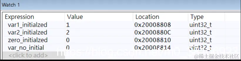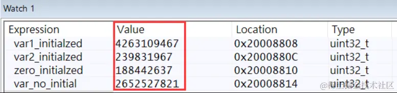 在全局变量未初始化之前,通过watch窗口可以看到,变量的值都是随机数。