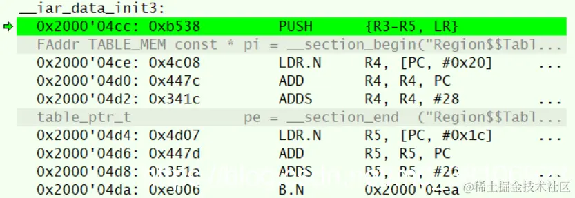此后进入到__iar_data_init3函数,在这里会完成所有具有初始值的全局/静态变量的赋值,以及零初始化全局/静态变量的清零操作,分别调用__iar_copy_init3和__iar_zero_init3,将保存在ROM区由链接器生成的变量初始值复制到变量的地址。注意,新的EWARM版本默认变量初始化操作可能会采用压缩算法,实际变量初始化调用的函数可能有区别。