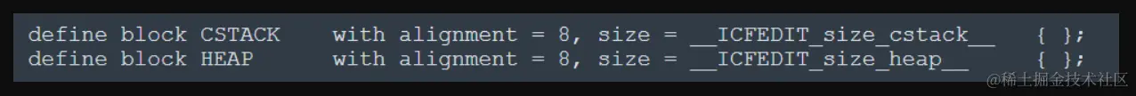 实际上这是获取堆栈基地址的操作。IAR在链接器脚本(*.icf)文件中定义堆栈,实际是定义了一个名为“CSTACK”的空闲块(block),如下图的脚本命令所示。所谓的块就是保留一段连续的地址空间,用来作为堆栈或者堆。当然,块也可以是用内容的,例如可以用来管理段,但不在今天的讨论范围。
