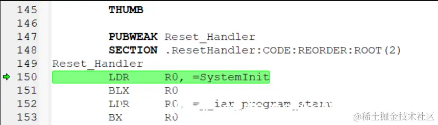 上面的THUMB命令表示接下来的代码采用THUMB模式(Cortex-M只支持Thumb-2指令集);SECTION用于定义一个段,段名为“.ResetHandler”,段的类型是代码(CODE);REODER指示用给定的名称开启一个新的段;ROOT指示链接器,当段内的符号没有被引用,链接器也不可以丢弃这个段。