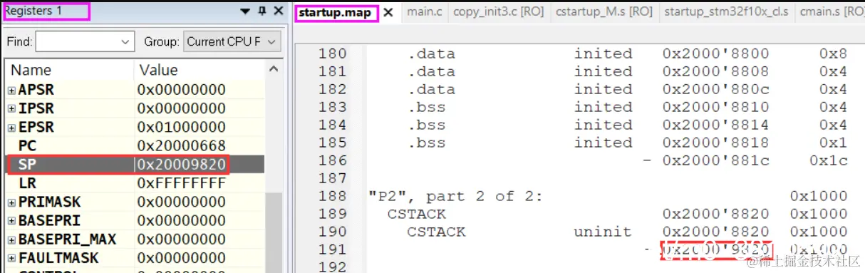 此时,通过寄存器观察窗口查看SP的值为0x20009820。通过链接时生成的map文件,查看CSTACK的地址范围,0x20009820正好是CSTACK的结束地址。有了MSP,C代码就能运行了。