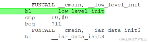 之后,跳转到__cmain函数执行。在__cmain中调用了一个__low_level_init函数,该函数专门用于提供给用户编写一个初阶的初始化操作,它在全局变量初始化之前执行,例如可用在__low_level_init中初始化SDRAM,这样就可以将全局变量定义到SDRAM中使用。