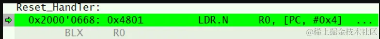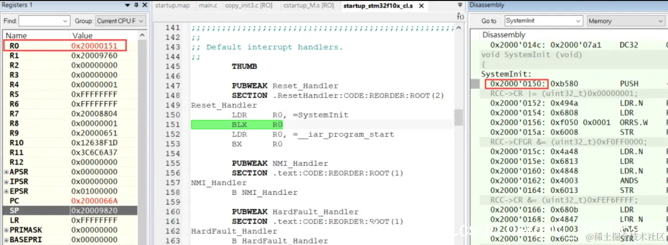 从上面的图可以发现一个问题,在反汇编窗口可以观察到SystemInit的地址是0x20000150,但加载到R0寄存器后却是0x20000151。这是因为在使用跳转指令更新PC时,需要置PC的LSB为1,以表示THUMB模式,由于Cortex-M不支持ARM模式,因此LSB总是1。