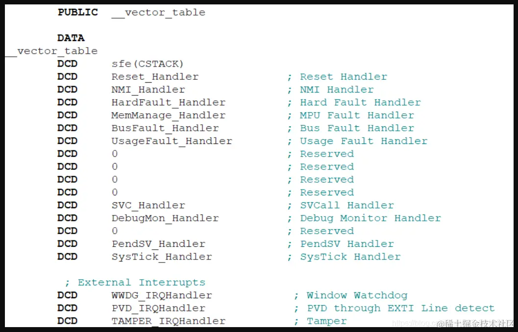 文件的开头定义了一个名为__vector_table的全局符号,“DATA”的作用是在代码段中定义一个数据区,用作向量表。数据区的内容是使用DCD指令定义的32位宽度常量,除了第一个sfe(CSTACK)比较特殊以为,其他的常量都是异常和中断服务程序的地址(在编译时函数名会被替换成函数的入口地址)。sfe(CSTACK)是IAR汇编器段操作,用于获取段(section)的结束地址,在这里意欲何为呢?