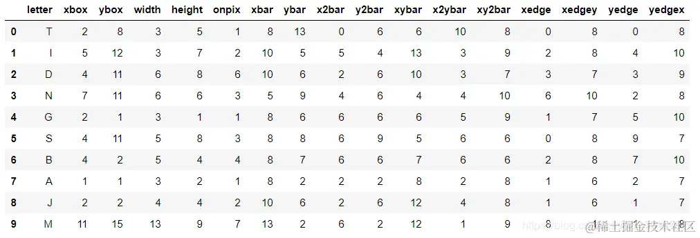 该数据集包含了26个英文大写字母的20000个样本。 每一个样本代表光学图像中的一个矩形区域,该区域只包含单一字符。 每一个样本包含16个自变量和letter目标变量,letter指示当前样本是哪一个字母。每一个特征变量的具体含义如下: