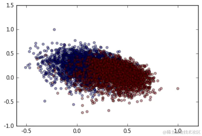 从上图中可以看到,好评与差评基本上可以通过一条直线区分开(蓝色为差评,红色为好评)