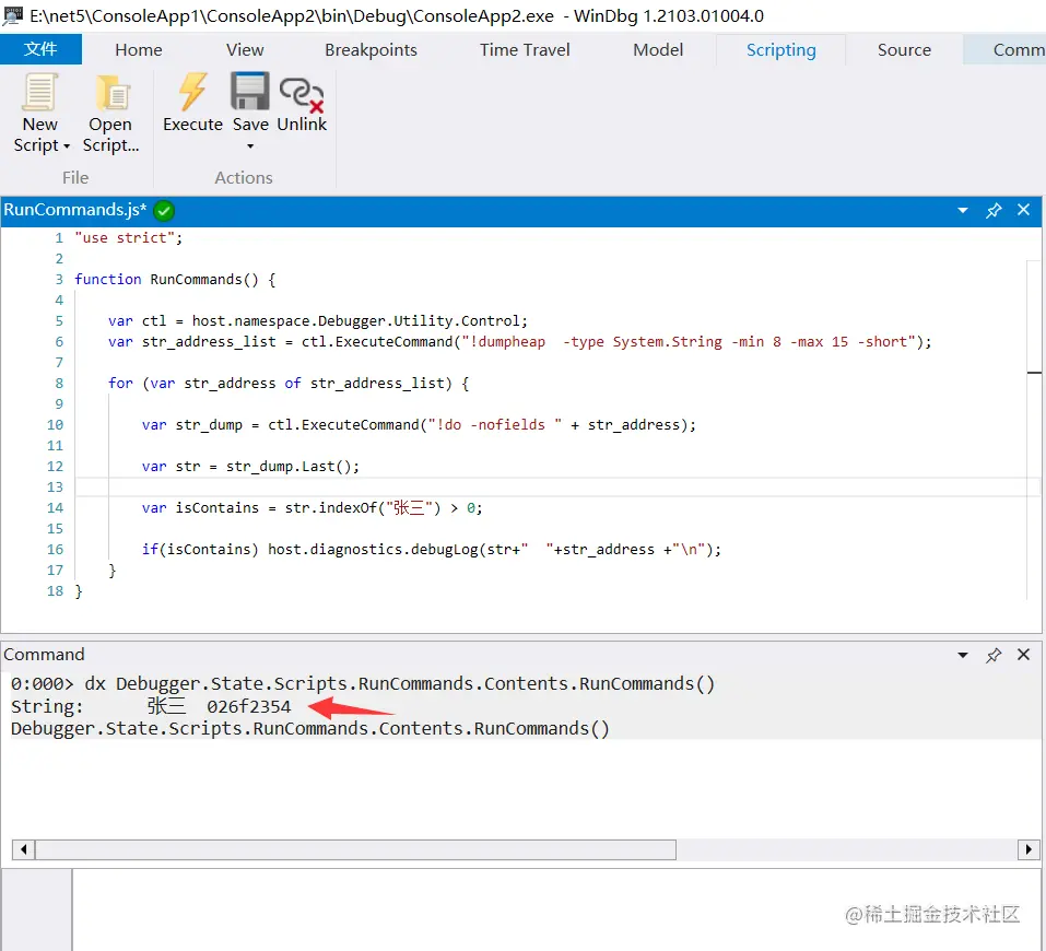 脚本的逻辑还是非常简单的,就是模拟刚才的人肉,最后在输出内容中判断是否有 张三 的字符串,如果有,连同 address 地址一起打印出来,脚本保存好之后,用 dx 命令来执行 RunCommands() 函数。