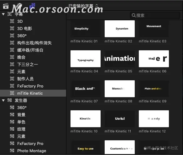 mTitle Kinetic拥有40种不同的文本效果,用户可以根据自己的需要设置字幕效果,这些标题可以快速为视频制作字幕与标题。该插件适用于Final Cut Pro X,需要的朋友们记得下载哦。