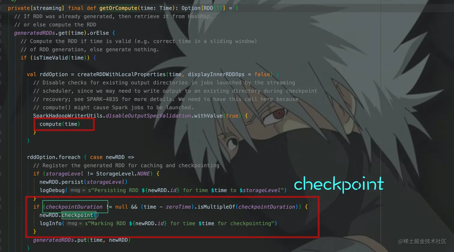 getOrCompute()主要功能为:计算、缓存、checkpoint。这里只需要记住几个地方:checkpointDuration,即checkpoint间隔,和调用了checkpoint()。其实真正的计算还是调用了compute(),接着去看compute()