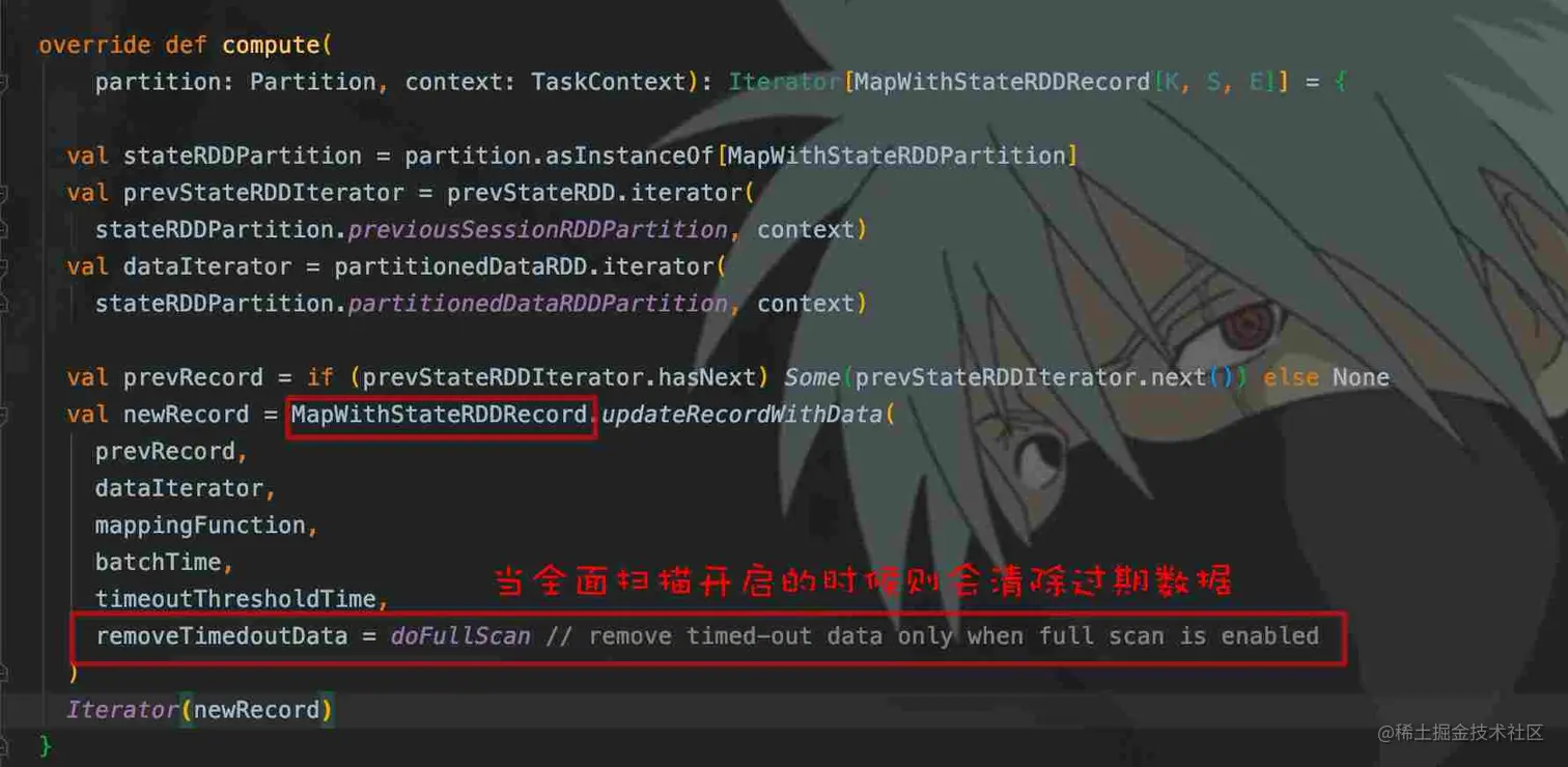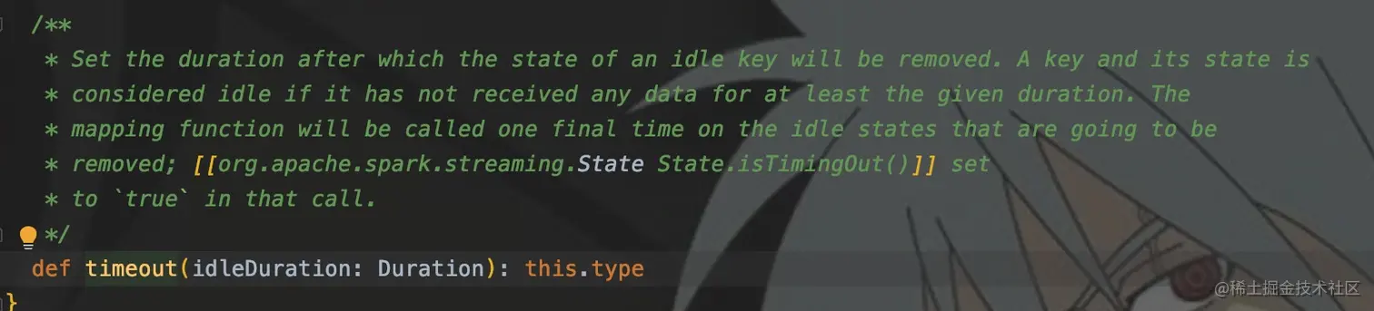 注释大概是这个意思:timeout()传入一个时间间隔参数,如果一个key在大于此间隔没有此key的数据流入,则被认为是空闲的,就会单独调用一次mapWithState中的func来清除这些空闲数据状态。