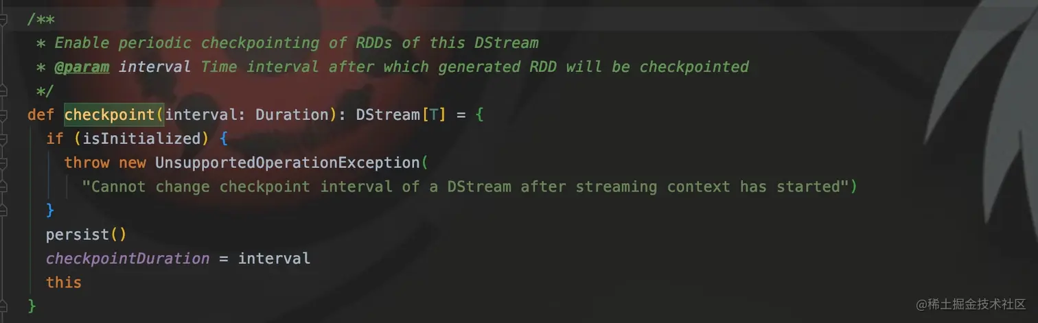 还记得在2中的getOrCompute()吗,当checkpointDuration不为null的时候,调用checkpoint()。