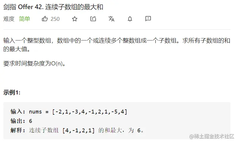- 从nums的第二个元素开始遍历,如果dp[i-1]>0,dp[i]则等于dp[i-1]+nums[i],反之则等于nums[i]