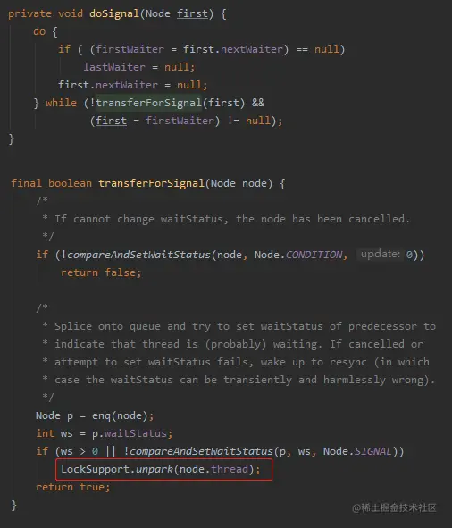 这个方法里面会调用 LockSupport.unpark(node.thred) 方法,唤醒线程: