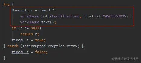 当 timed 参数为 true 的时候,会执行 workQueue.poll(keepAliveTime,TimeUnit.NANOSECONDS) 方法。