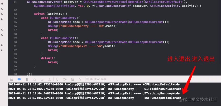 证明模式切换会退出RunLoop,再重新进入RunLoop