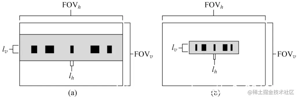 视场(Field of View,FOV)指成像系统中图像传感器可以监测到的最大区域。在机器视觉系统设计时,考虑到一般都会使被检测目标尽量填满整视场,因此常用视场大小代替目标的最大长度Lmax来计算视觉系统的像素分辨率。如下图(a)所示,表示被检测目标在水平方向上占据整个视场,而图(b)表示目标未填满视场。
