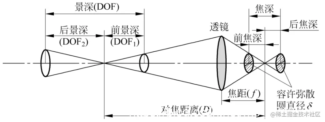 在成像系统的焦点前后,物点光线呈锥状开始聚集和扩散,点的影像沿光轴在焦点前后逐渐变得模糊,形成一个扩大的圆,这个圆称为弥散圆(circle of confusion)。若这个圆形影像的直径足够小(离焦点较近),成像会足够清晰,如果圆形再大些(远离焦点),成像就会显得模糊。当在某个临界位置所成的像不能被辨认时,则该圆就被称为容许弥散圆(permissible circle of confusion)。焦点前后两个容许弥散圆之间的距离称为焦深。在目标物一侧,焦深对应的范围就是景深。