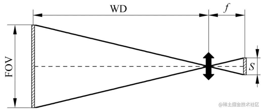根据该简化模型,可以得出机器视觉系统图像传感器尺寸S(传感器平面某个方向上的长度)、视场FOV、工作距离WD及镜头焦距f之间的约束关系: