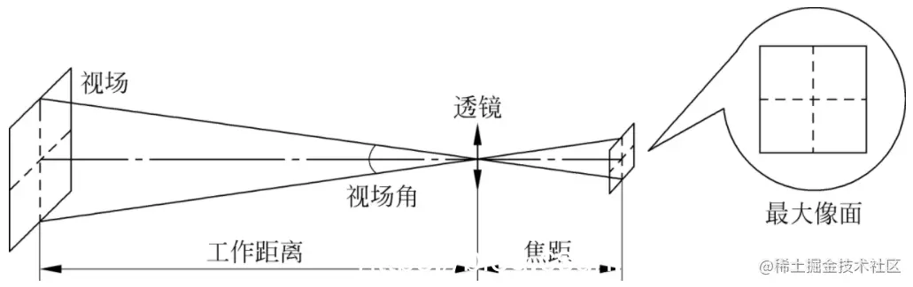 由于机器视觉成像系统中的传感器多制作成长方形或正方形,因此镜头的最大像面常用它可以支持的最大传感器尺寸(单位为英寸,1英寸约为2.54cm)来表示。相应地,镜头的视场也可以用最大像面所对应的横向和纵向观测距离或视场角来表示,如下图所示: