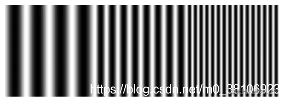 - 镜头空间分辨率表示它的空间极限分辨能力,常用拍摄正弦光栅的方法来测试。如果从信号处理的角度来看,任何非周期图像信号都可以被看作周期图像(或子图像)的叠加,而任何周期图像又都可以被分解为亮度按正弦变化的图形的叠加。因此,通过研究镜头对亮度按正弦变化图形的反应,就可以研究镜头的性能和分辨率。正弦光栅就是亮度按照正弦变化的图像,如下图所示: