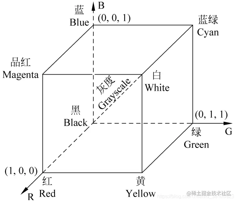 根据色彩不同,图像可以分为彩色图像和黑白(灰度)图像。通过对人眼结构及特性的研究发现,人眼对红(R)、绿(G)、蓝(B)3种颜色特别敏感,不同强度的RGB混合后刺激视网膜上的锥状体,使人眼可以感知自然界中的几乎所有色彩。反过来,自然界中的色彩可以分解为不同强度RGB基本色的组合,这种表示色彩的方式称为RGB颜色模型或RGB色彩空间,如下图所示:
