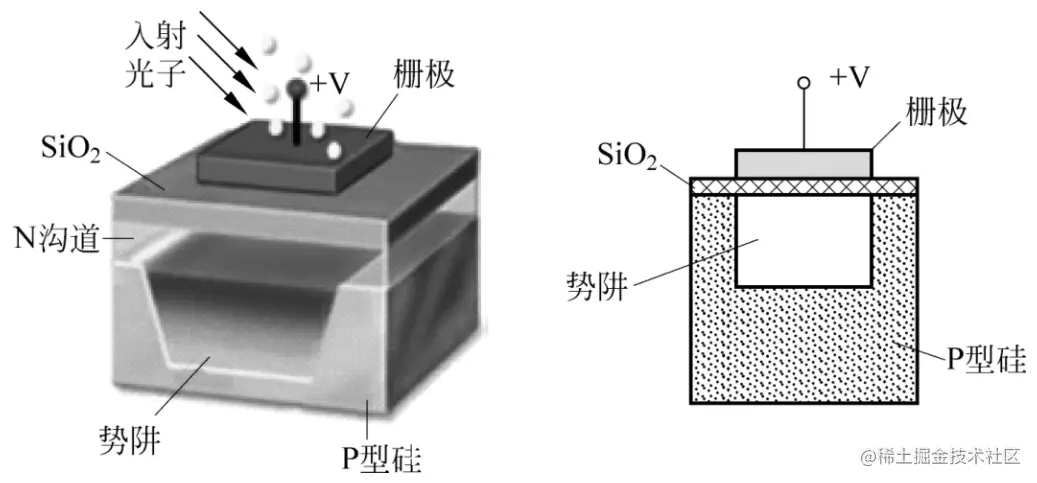 CCD实际上可以被看作由多个MOS (Metal Oxide Semiconductor)电容组成。在P型单晶硅的衬底上通过氧化形成一层厚度约为100~150nm的SiOz绝缘层,再在SiO,表面按一定层次蒸镀一层金属或多晶硅层作为电极,最后在衬底和电极间加上一个偏置电压(栅极电压),即可形成一个MOS电容器,如下图所示: