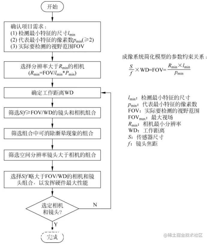 - 根据项目要求和机器视觉成像系统模型,确定相机的传感器尺寸及分辨率。