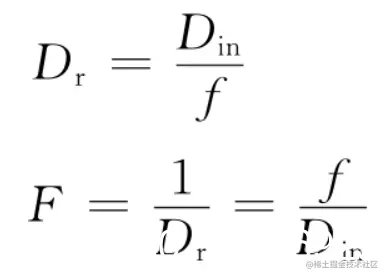 - F为镜头的拍摄光圈(aperture)值。光圈值F常用镜头焦距和镜头入瞳的有效直径Din的比值来表示,它是镜头相对孔径Dr的倒数,即: