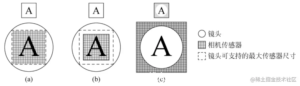 如图下图(c)所示,如果相机传感器的尺寸大于镜头可支持的最大传感器尺寸时,所生成的图像就会形成类似隧道的效果,该现象称为渐晕现象。渐晕现象会增加机器视觉系统的开发难度,因此应尽量避免。下图中的(a) 、(b)分别显示了在镜头可支持的最大传感器尺寸等于或大于相机的传感器尺寸时视觉系统的成像情况,这两种情况下机器视觉系统均能正常工作。