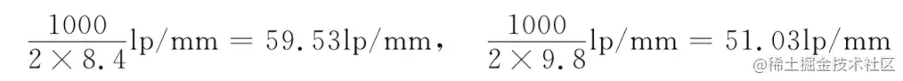 - 相机的空间分辨率却表示它的空间极限分辨能力。根据前述相机奈奎斯特定律,相机要能恢复空间图像,必须至少使用2个像素来表示图像的最小单元。如果用研究镜头的空间分辨率类似的方法来研究相机空间分辨率,则正弦光栅中的每对线需要至少2个像素来表示。由此,可以通过像素的物理大小来计算相机的空间分辨率。例如,某相机的像素物理大小为8.4um×9.8um,则相机在横纵方向上的空间分辨率为: