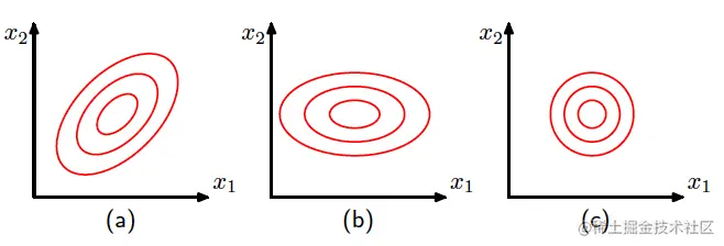 在原来的x坐标系下,各分量之间可能有相关性,对应二维时候的图像为下图(1),而在新的y坐标系下,协方差矩阵变为对角矩阵,也因此图像变为下图中(2)的情况,而若各分量同方差,则会变为类似于标准正态分布的同心圆即下图(3)的形式:
