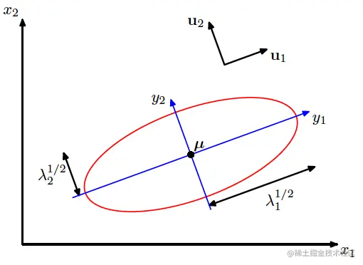 如果做换元y=U′(x−μ),则有Δ2=y′Λ−1y,也就是说,通过换元,我们将原来在x坐标系下的分布,变成了一个在y坐标系下的、各个分量互相不相关的分布。如图所示: