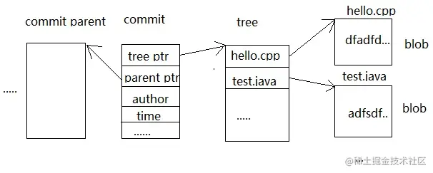从根本上讲,git是一套内容寻址的文件系统,它存储的也是key-value键值对,然后根据key值来查找value的,说到寻址就会想到指针吧,不错,git也是根据指针来寻址的,这些指针就存储在git的对象中。git一共有3种对象,commit对象,tree对象和blob对象。下面便是这3个对象: