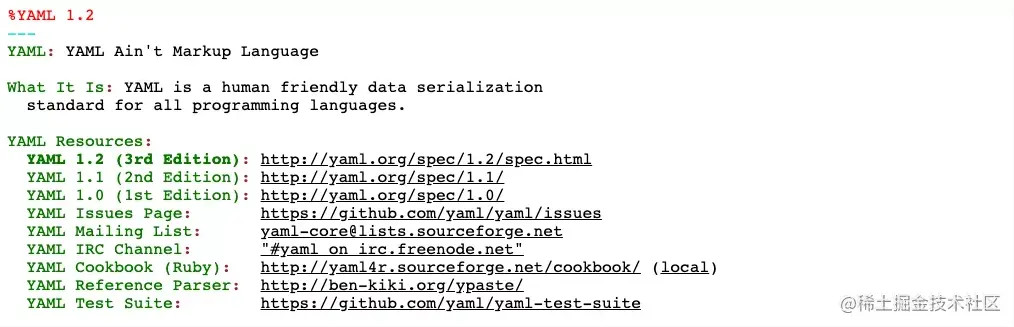 YAML 全称是 ”YAML Ain’t a Markup Language” 的递归缩写,该语言的设计参考了 JSON / XML 和 SDL 等语言,强调以数据为中心,简洁易读,编写简单。