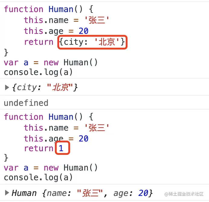 - 如果构造函数return的不是一个对象的话,则会继续返回这个对象 由上述2、 3可得知,之前的代码可以改写为如下: