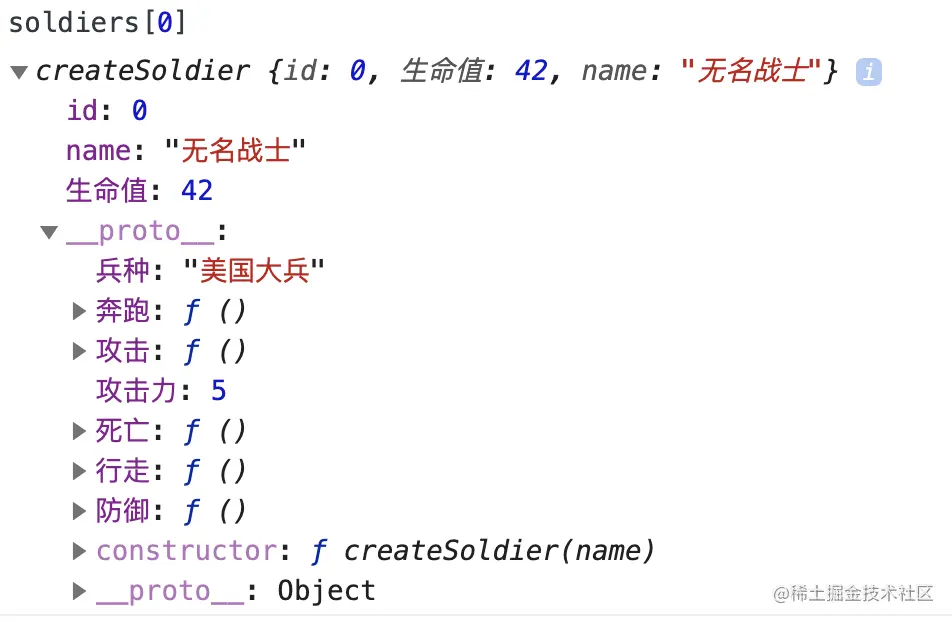 第五次优化,来自 js 之父的关怀。在定义一个函数后,会有系统默认的一个属性prototype,表示谁创建了我们。若使用 createSoldier.prototype = {} 则会覆盖原先的 constructor。于是我们可以一个一个赋值,则不会覆盖原有的constructor。