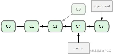 把一个分支的修改整合到另一个分支的办法有两种,第一种就是 git merge 操作,另一种就是 git rebase 操作,该命令原理就是回到两个分支最近的共同祖先,根据当前分支(也就是要进行衍合的分支experiment)后续的历次提交对象(这里只有一个 C3),生成一系列文件补丁,然后以基底分支(也就是主干分支master)最后一个提交对象(C4)为新的出发点,逐个应用之前准备好的补丁文件,最后会生成一个新的合并提交对象(C3’),从而改写 experiment 的提交历史,使它成为 master 分支的直接下游。如下图所示: