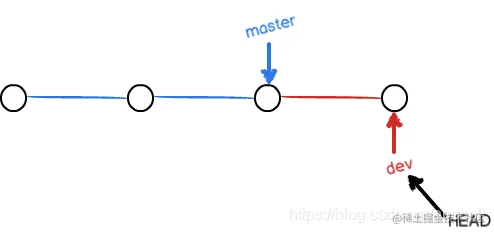 若创建新分支,如dev分支,git会新建一个dev指针,与master指针功能一样。先是指向和master同样的位置,当checkout切换到dev分支时候,HEAD指针就指向了dev指针了,当在dev分支下提交,master指针不动。如下图2和图3: